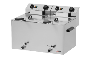 obsah oleje 2 x 8 l, celonerezové provedení, 2 x výpustný ventil, spec. úprava nerezové topné spirály, studená zóna, síťový vypínač, kontrolka chodu a vyhřátí, regulace teploty 50 - 190° C, rozměr koše: 2 x 21 x 23,5 x 10 cm, napětí 230 V / 50 Hz, výkon 2x 3 kW