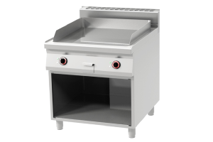 grilovací deska o síle 12 mm, zásuvka na odpadní tekutiny, 2x samostatně ovládaná vyhřívaná plocha, chromovaný povrch desky, samostatně stojící jednotka na skříňce, s dvířky jako volitelnou možností, vynikající tepelná vodivost desky