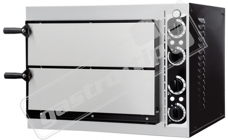Kompaktní dvoukomorový model pizza pece vhodný pro přípravu klasické pizzy (čerstvé, nebo mražené). Mechanický termostat a časovač ovládá spodní a horní tělesa. Nerezové provedení čela pece a dveří, kvalitní odizolování, komora se šamotovým akumulačním dnem. Provedení VETRO navíc s prosklenými dvířky a osvětlením komory nabízí maximální přehled o pečení uvnitř komory.