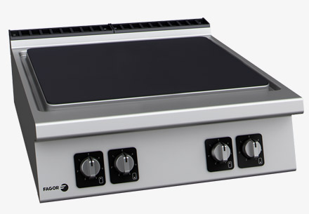 • Litinové varné plotýnky o velikosti 300x300 mm a výkonu 4 kW, těsně zabudované do zapuštěné horní desky.