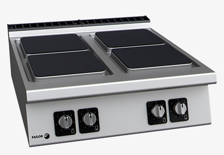 • Litinové varné plotýnky o velikosti 300x300 mm a výkonu 4 kW, těsně zabudované do zapuštěné horní desky.