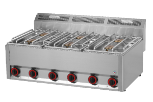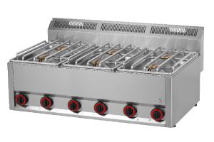 celonerezové provedení, vysoce výkonné hořáky, 6x hořák 4,5 kW, varná jednotka pro použití jako stacionární na stole nebo podestavbě, pevná konstrukce hořáků, mosazné odnímatelné hořáky, odnímatelná horní deska pro snadný přístup k hořákům, nerezový rošt