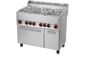 celonerezové provedení, vysoce výkonné hořáky, 6x hořák 4,5 kW, pevná konstrukce hořáků, mosazné odnímatelné hořáky, odnímatelná horní deska pro snadný přístup k hořákům, nerezový rošt, konvekční trouba s venti látorem GN 1/1