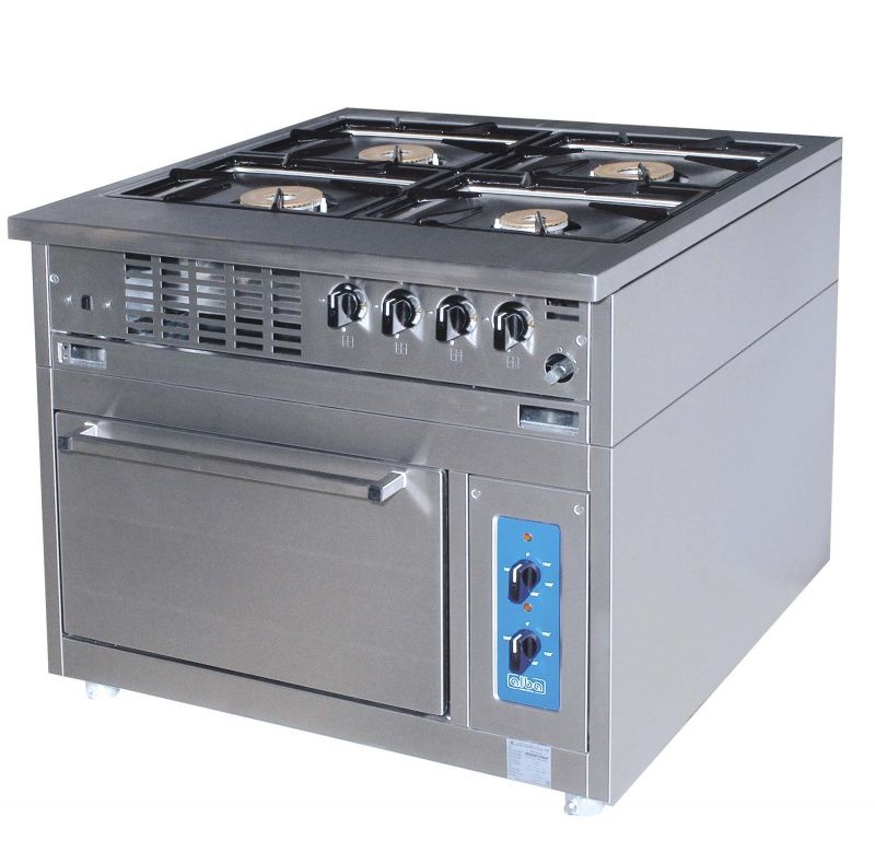 V horním rámu jsou umístěny čtyři plynové hořáky, ovládané zpředu čtyřmi regulačními kohouty, vybavenými termoelektrickými pojistkami, jež zajišťují bezpečné hoření plynových hořáků.