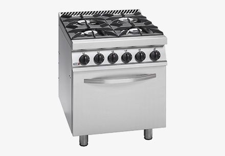 Plynový sporák se čtyřmi hořáky a elektrickou troubou vyrobený z nerezové oceli.