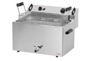objem vany 16 l, celonerezové provedení, nerezové spirály, výpustný ventil, studená zóna, regulace teploty 50 - 190° C, pojistný termostat, kontrolka chodu a vyhřátí, velká kapacita, vhodné pro školní jídelny, koš: 45,5 x 24,5 x 8 cm, napětí 400 V /3N/ 50 Hz, výkon 9 kW