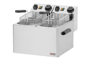 obsah oleje 2x 5 l, celonerezové provedení, spec. úprava nerezové topné spirály, síťový vypínač, studená zóna, kontrolka chodu a vyhřátí, regulace teploty 50 - 190° C, rozměr koše: 2 x 13 x 23,5 x 10 cm, napětí 230 V / 50 Hz, výkon 2x 3 kW
