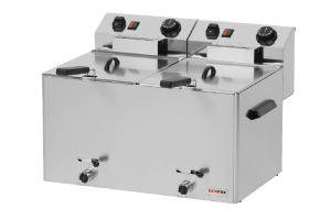 obsah oleje 2 x 8 l, celonerezové provedení, 2 x výpustný ventil, spec. úprava nerezové topné spirály, studená zóna, síťový vypínač, kontrolka chodu a vyhřátí, regulace teploty 50 - 190° C, rozměr koše: 2 x 21 x 23,5 x 10 cm, napětí 230 V / 50 Hz, výkon 2x 3 kW