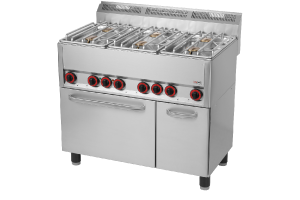 celonerezové provedení, vysoce výkonné hořáky, 6x hořák 4,5 kW, pevná konstrukce hořáků, mosazné odnímatelné hořáky, odnímatelná horní deska pro snadný přístup k hořákům, nerezový rošt, konvekční trouba s venti látorem GN 1/1